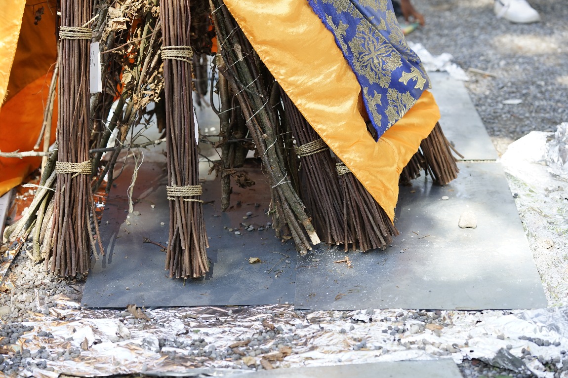 Der Scheiterhaufen ist vor Beginn der Zeremonie in ein Tuch gehüllt.