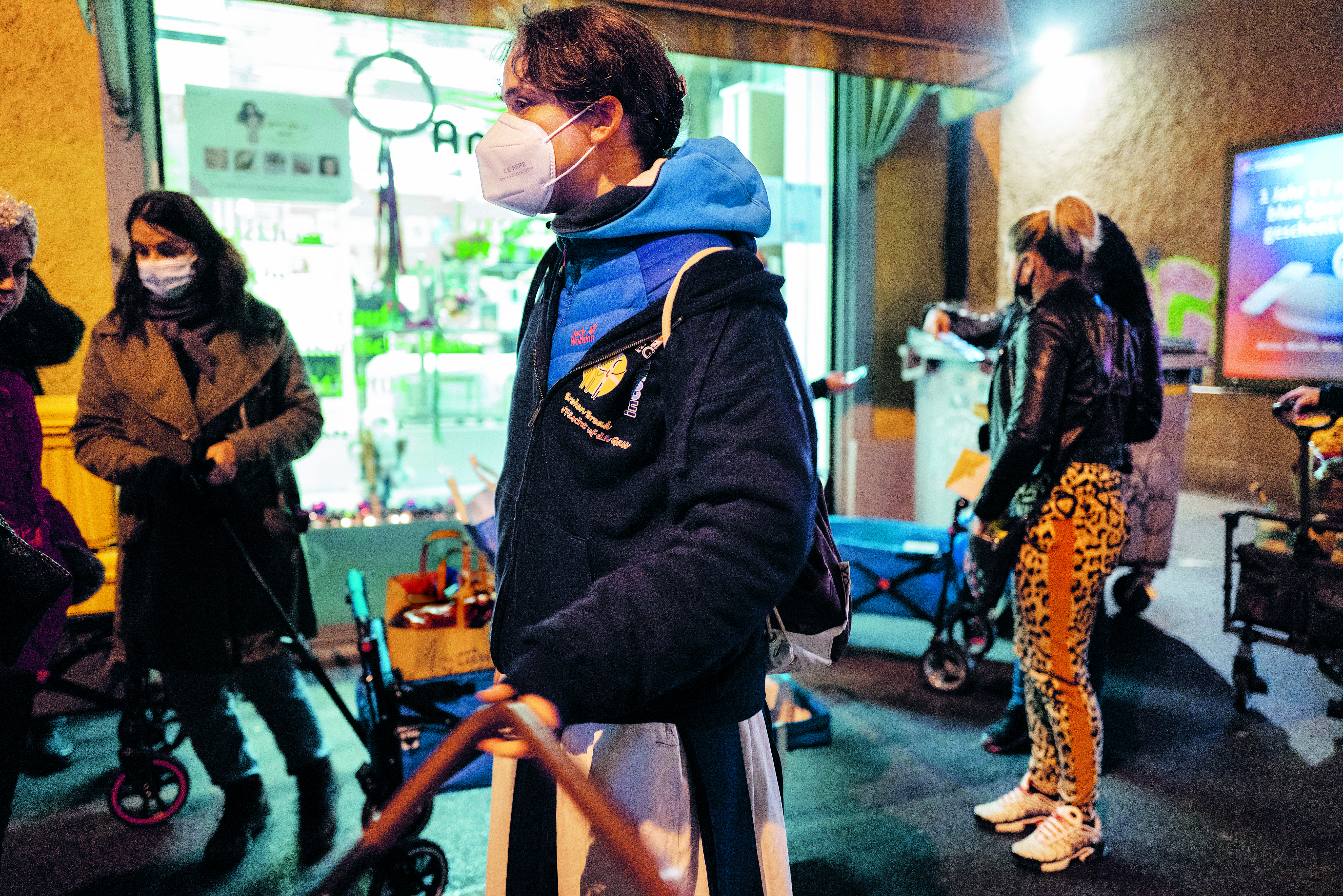 Die Pandemie drängt viele Menschen in eine schwierige Situation: Schwester Ariane inmitten von Freiwilligen, die einer Gruppe von Sexarbeiterinnen warmes Essen und Gutscheine abgeben